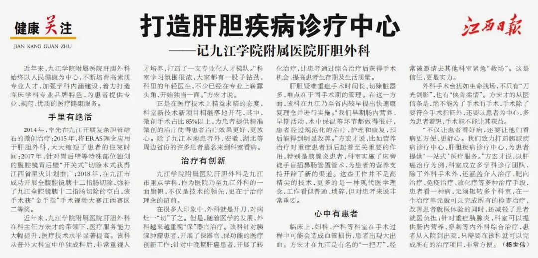 九江学院附属医院肝胆外科是九江市重点学科,作为医院乃至九江外科的一面旗帜,不仅是技术的领先,更在于治疗理念的超前。