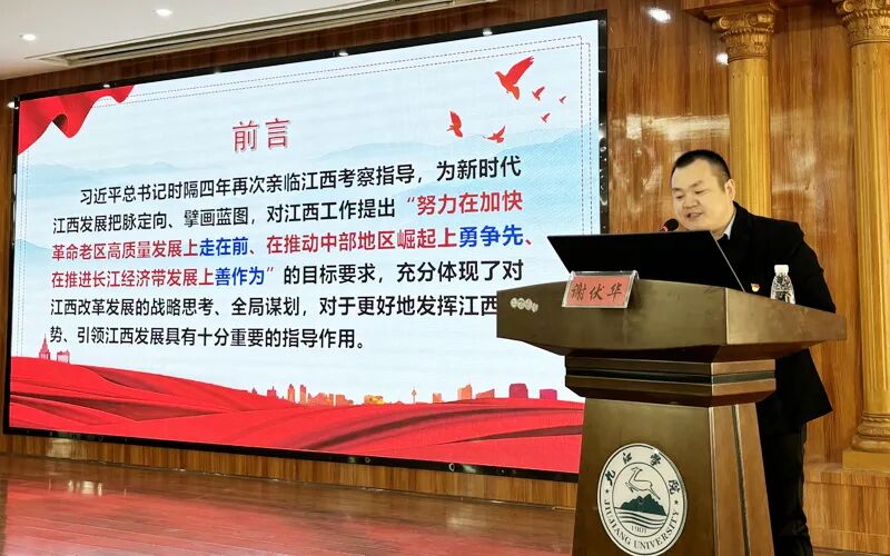 谢伏华教授以《感恩奋进千帆竞,潮涌中部满眼春》为题,从深刻把握习近平总书记再次考察江西的重大意义、深刻把握习近平总书记对江西发展提出的新的战略定位、深刻把握习近平总书记对江西发展提出的任务要求等方面进行了宣讲,他运用丰富史实、生动案例、翔实数据进行讲解,带领大家深入学习领会了习近平总书记考察江西重要讲话精神实质。并在讲课中指出,习近平总书记时隔四年再次亲临江西考察调研,指导我们走好江西高质量发展之路,充分体现了习近平总书记对江西改革发展的战略思考、全局谋划和倾情牵挂,为我们奋进新征程注入了强大精神动力。
