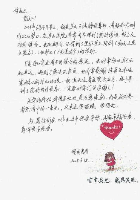 根据信中所写和付书彩的回忆,患者当时面部受伤,疼痛难受又不好表达,紧急的状况下根本没能向医生提出是否可以尽量减少缝合后的疤痕等诉求,但付书彩为了患者考虑,直接采用了美容缝合术。关键是“现在伤口的缝合完全看不出痕迹,让我感叹自己如此幸运,不仅觉得付书彩医生医术精湛,更为他的医德而感恩!”“我记得患者是位40多岁的女士,受伤又在脸鼻,遇到这种情况,我们一般会采用美容缝合手法,尽可能让伤疤‘隐形’”付书彩对记者说“作为医生,不光是治病救人,也得尽可能为患者的生命质量、生活质量考虑!”