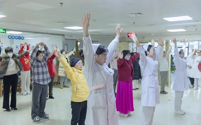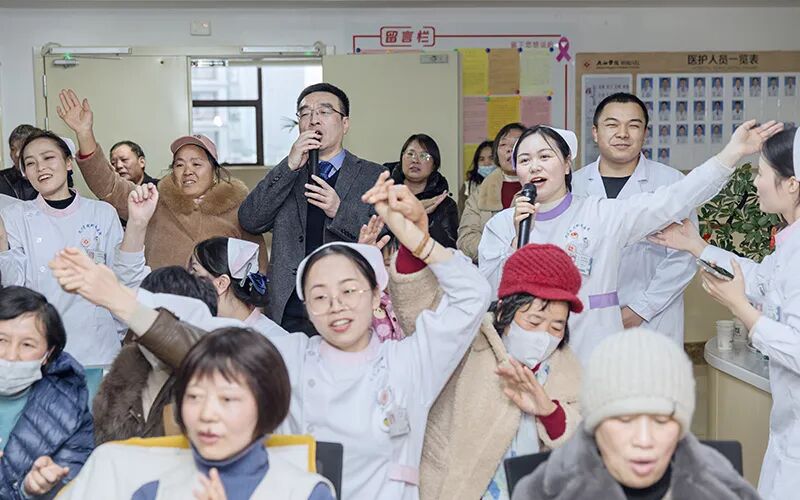 整场活动由一位护士和一位患者担任主持人。在表演娱乐环节,医生们献上的独唱、患者演唱的黄梅戏《天仙配》选段、病区后勤阿姨们表演的红扇舞以及大家共同参与的欢快恰恰舞……医患们通过柔美的唱腔表达着坚定信念,用动感的节奏传递出重拾健康后的喜悦与活力,娱乐互动间洋溢着真诚的祝福和鼓励。在护理人员的带领下,患者们还一起表演了乳腺康复操,动作虽然简单,却蕴含着科学的康复理念。